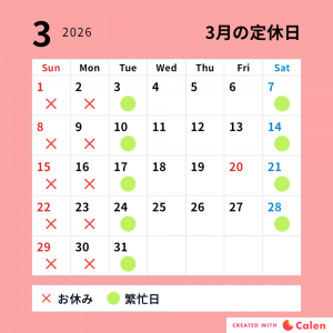 2026年3月のお休み 月別アーカイブ 2026年2月 2026年1月 2025年11月 2025年10月 2025年9月 2025年8月 2025年7月 2025年5月 2025年4月 2025年3月 2025年2月 2025年1月 2026/02/25 ● は、お荷物が混み合います。ご容赦ください。 « 前へ一覧へ